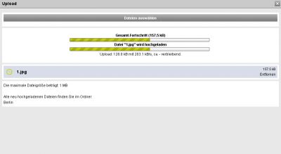 Zu jedem Bild oder Dokument kann eine Beschreibung angelegt werden. Das ist gegenüber dem FTP-Zugang ein großer Vorteil! Der Download und Upload großer Bilder läuft erstaunlich schnell und erreicht FTP-Qualität. Es gibt auch eine Upload-Anzeige, die den aktuellen Fortschritt der Datenübertragung anzeigt.